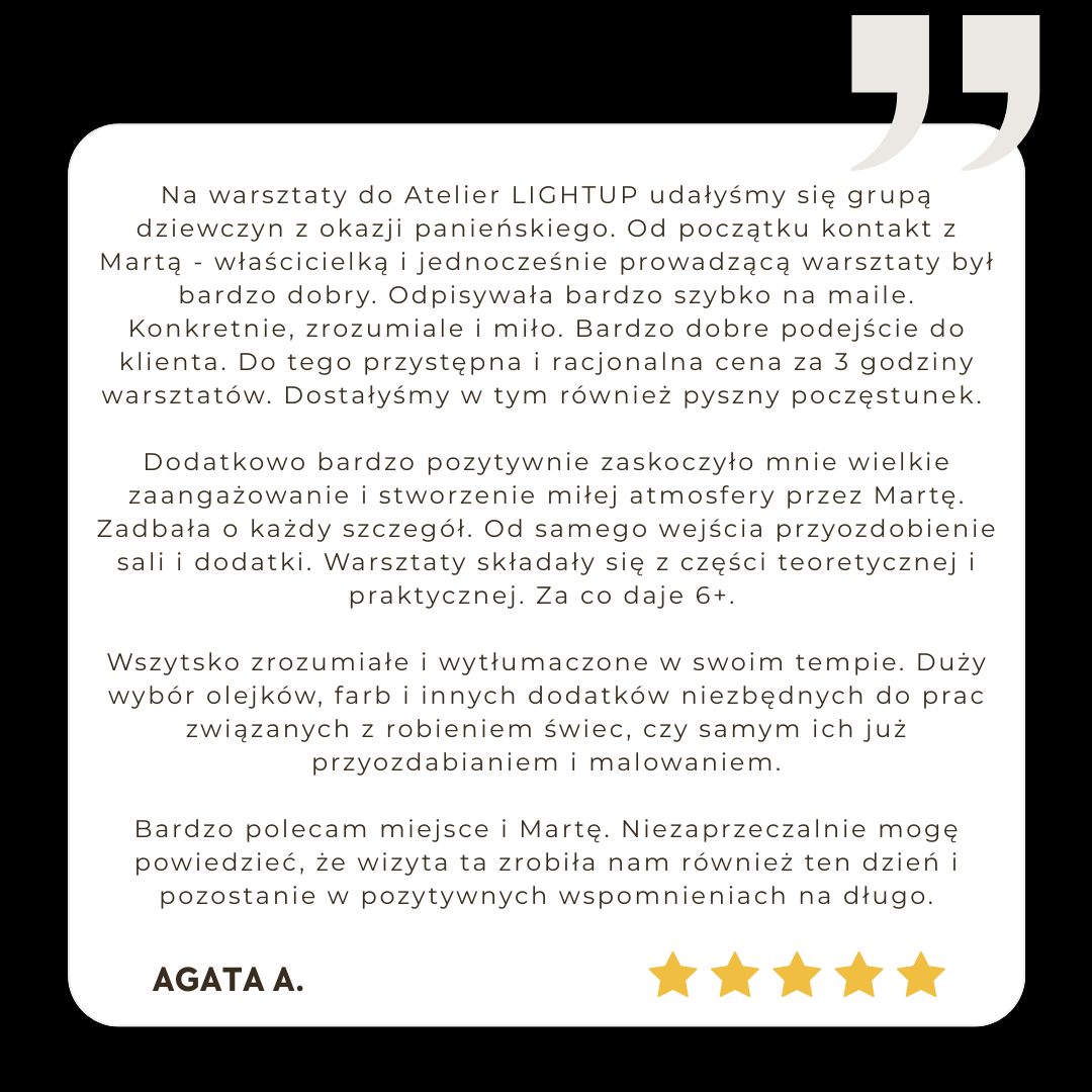 Podczas warsztatów przejdziemy przez cały proces tworzenia świec, dowiecie się jakie są woski na rynku i czym się różnią, czemu nie powinno używać się olejków eterycznych w świecach oraz jak dbać o świece, aby cieszyć się płomieniem i zapachem na dłużej.