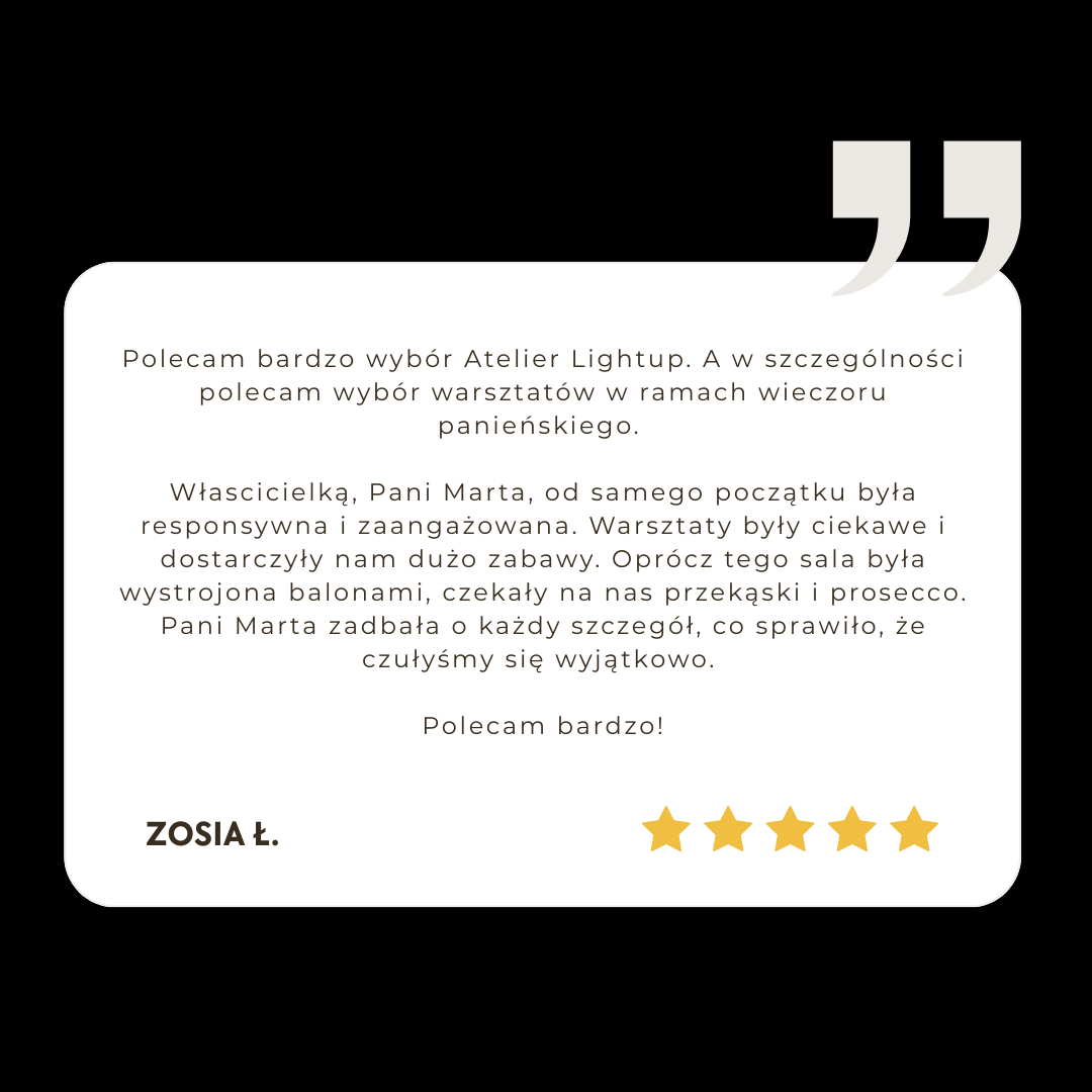Zorganizuj prywatne warsztaty na wieczór panieński w ATELIER LIGHTUP w Warszawie na Żoliborzu. Studio będzie tylko do Waszej dyspozycji, przygotujemy słodki poczęstunek oraz napoje i wprowadzimy was w tajniki wybranego rękodzieła.